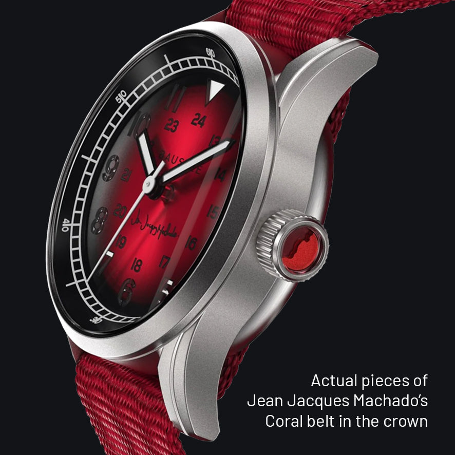 Screw-down crown filled with an actual piece of Jean Jacques's coral belt.