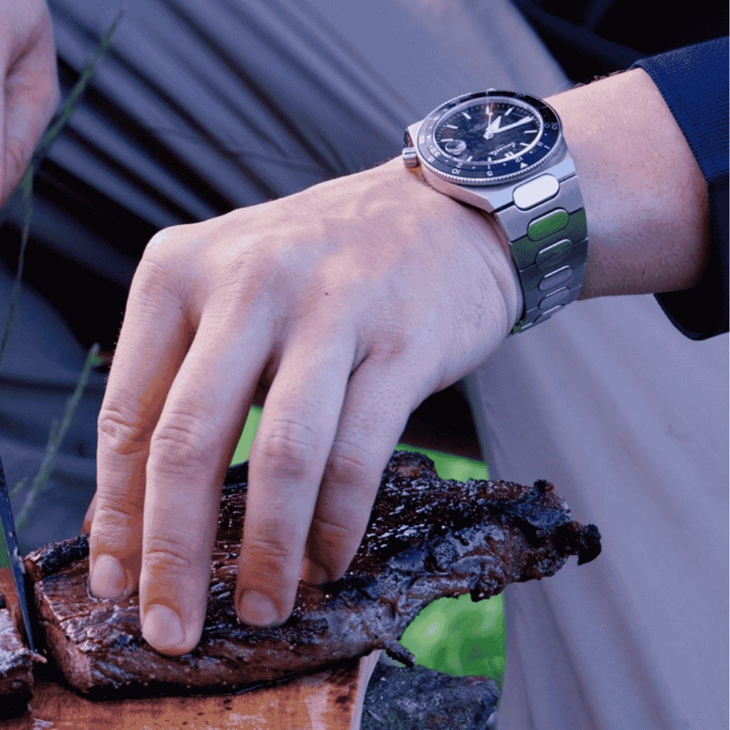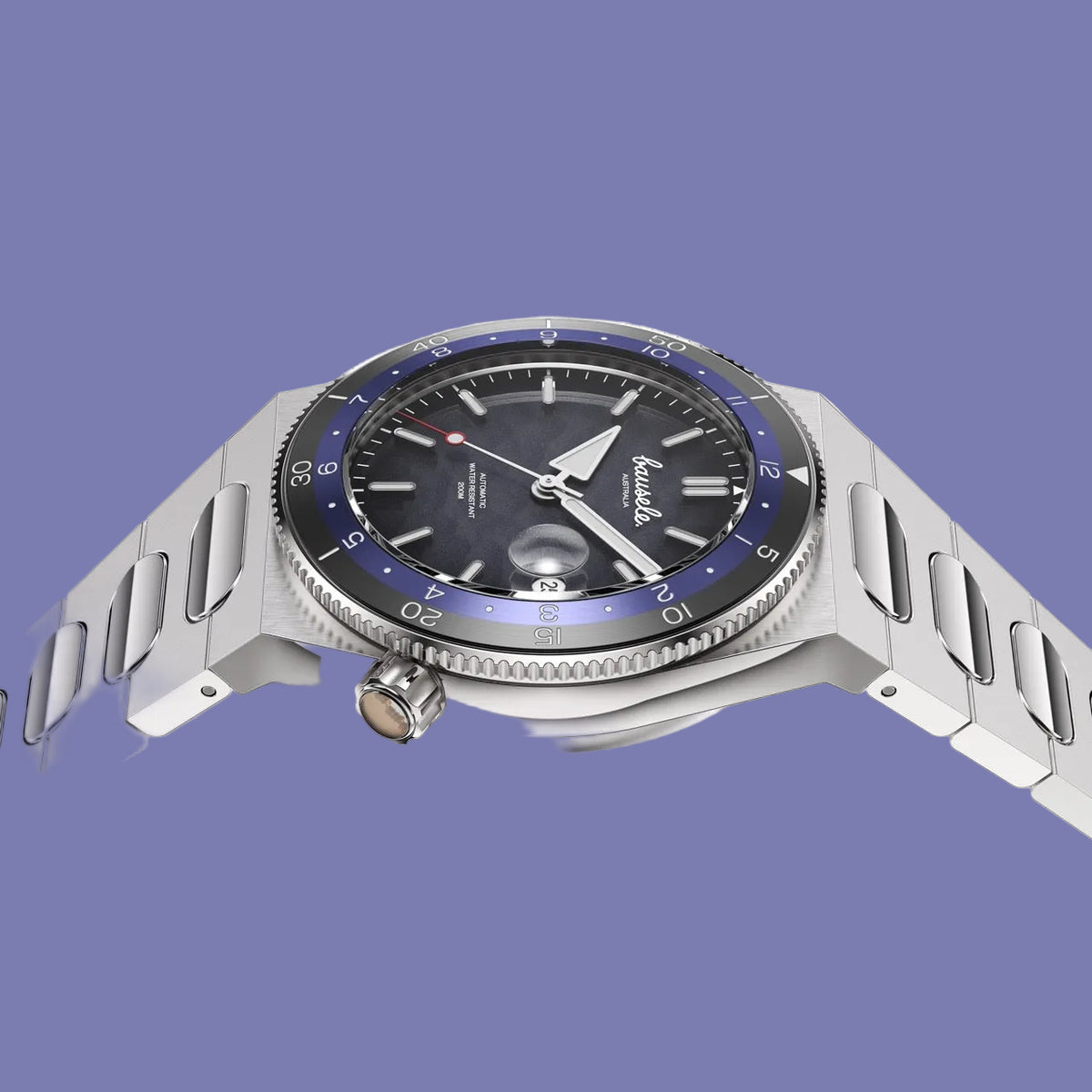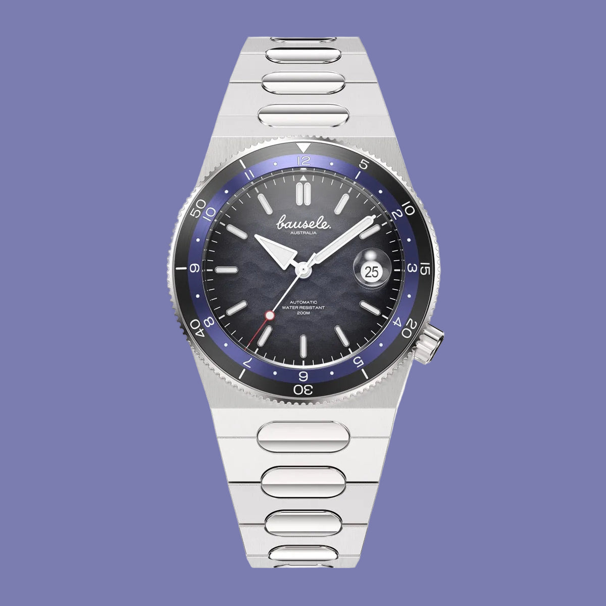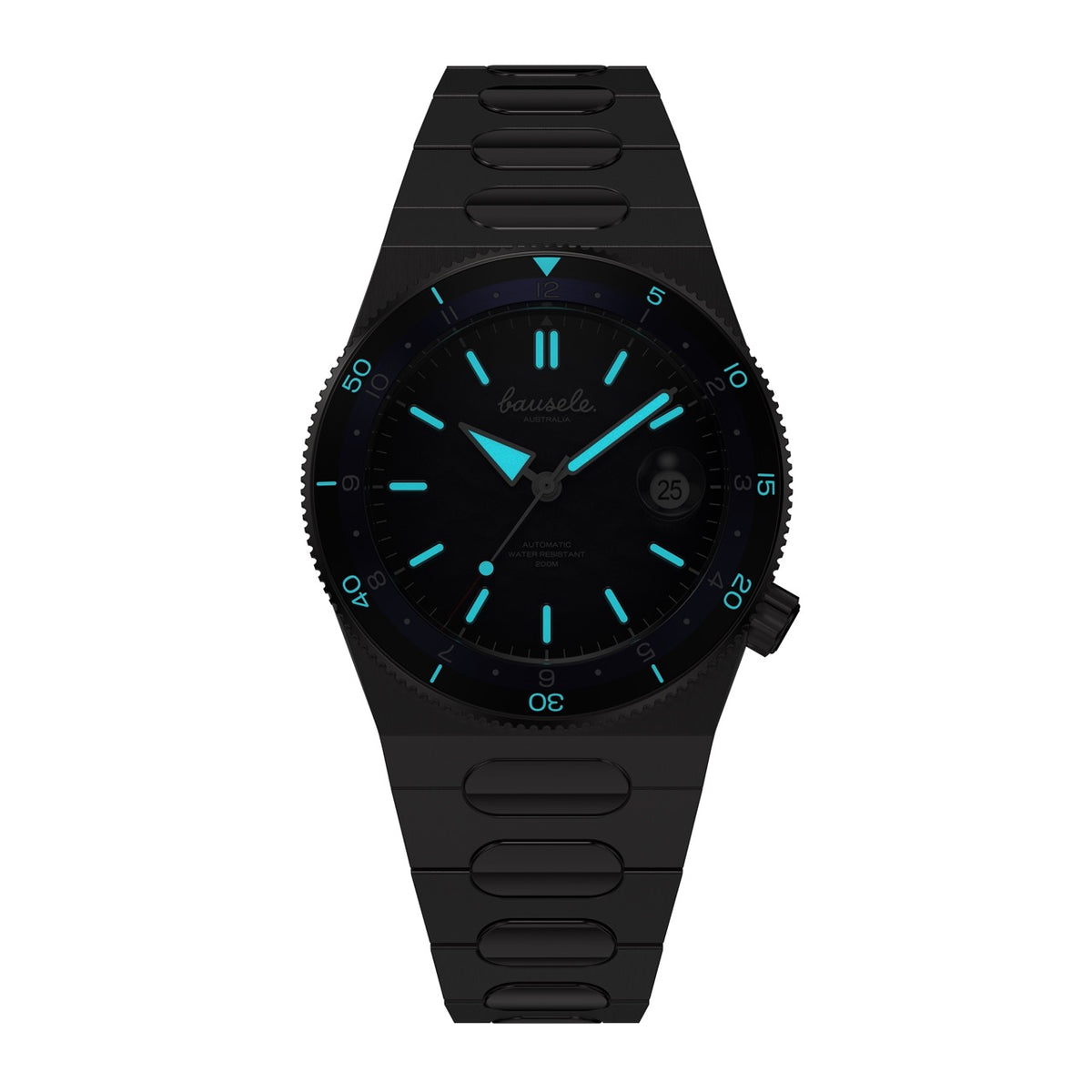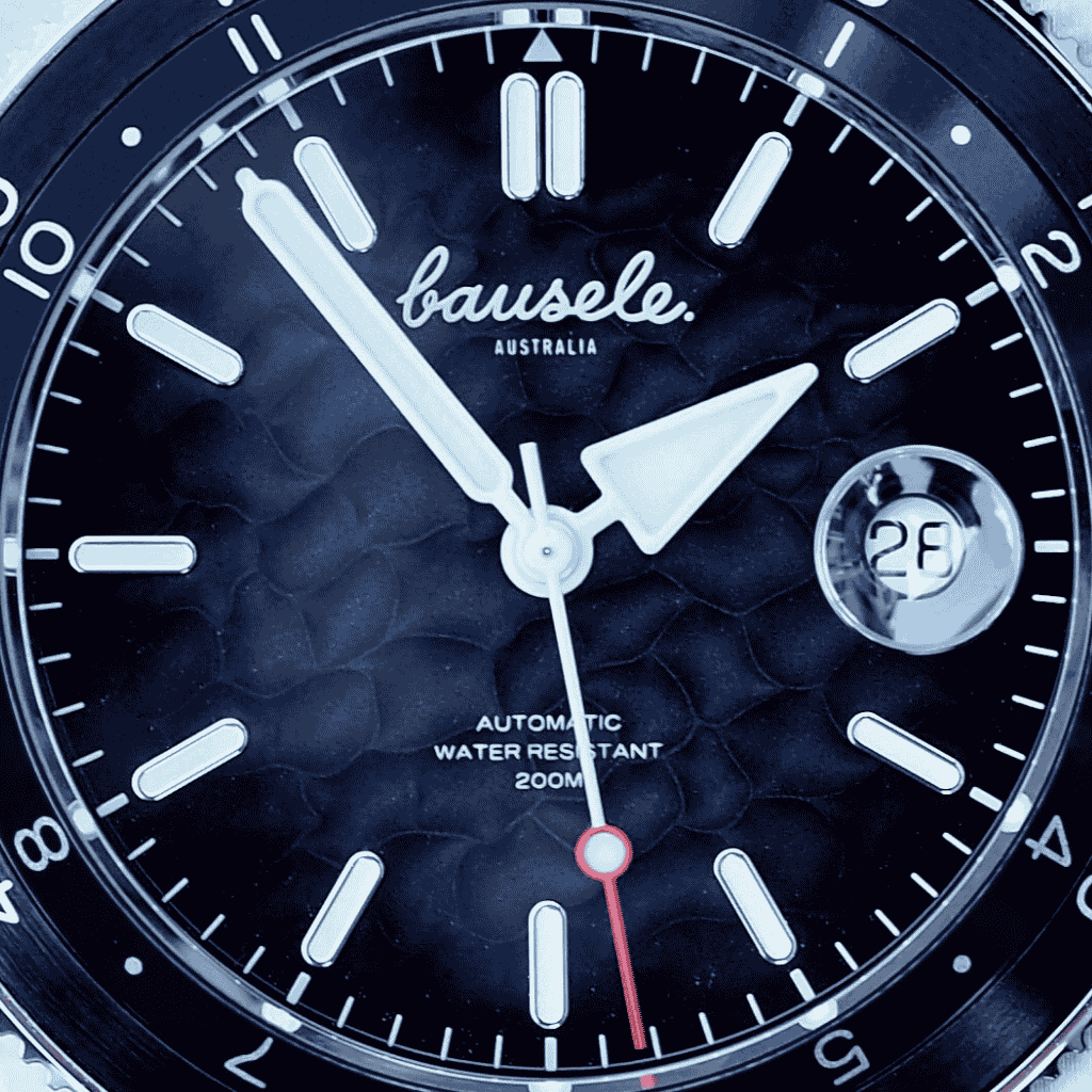 200メートル防水。リューズチャンバーにはカランビンビーチの砂が入っています。