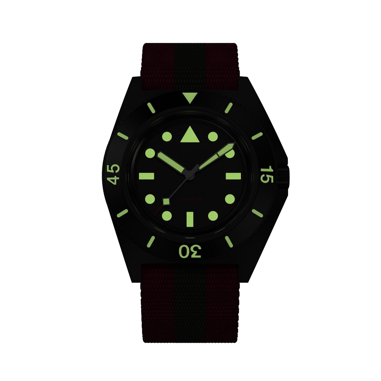 2-layer dial, “old radium” Luminova® on numerals and hours & minute hands, count down bezel with “old radium” Luminova®